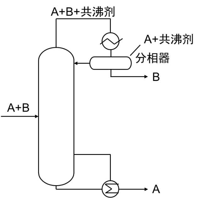 共沸精餾是在體系中加入第三組分,能與原溶液中的一個或者兩個組分形成沸點比原來組分和原來恒沸物的沸點更低的新的最低共沸物,使得組分間的相對揮發度增大,從而使原溶液易于分離的精餾方法。加入的第三組分稱為恒沸劑或者夾帶劑。